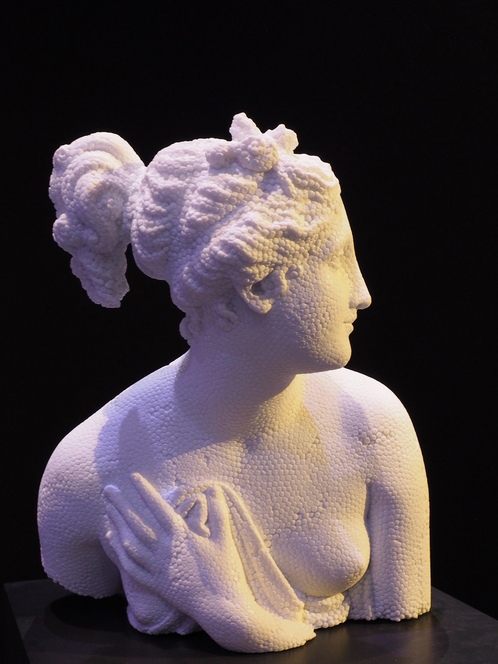 Comme nous, vous pensez immédiatement à du polystyrène. Je vous assure que même à 2 centimètres de la statue, on pense que ça en est… Eh bien non ! Il s’agit d’un buste en marbre, dans la plus pure tradition ! Oui messieurs dames ! Avec Venere Italica, Fabio Viale en employé du marbre blanc pour imiter le polystyrène, imitant lui-même le buste en marbre représentant de manière réaliste une jeune femme… La mise en abyme est totalement dingue !