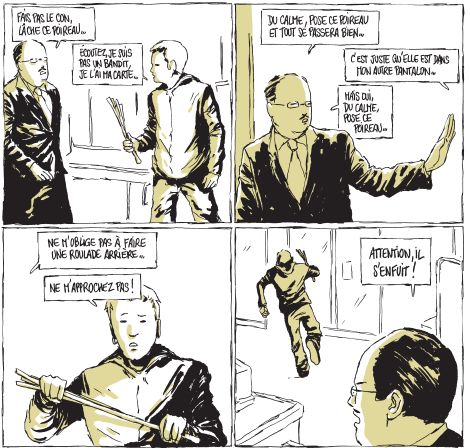 Au niveau du style, le dessin vous surprendra peut-être : contrairement à la BD d’humour que l’on a l’habitude de trouver dans les rayons, Fabcaro propose des images en trois couleurs qui rappellent les magazines de mode pour homme des années 60… Pas de gros nez ni de grosse caricature donc, mais des traits fins et des dessins épurées.