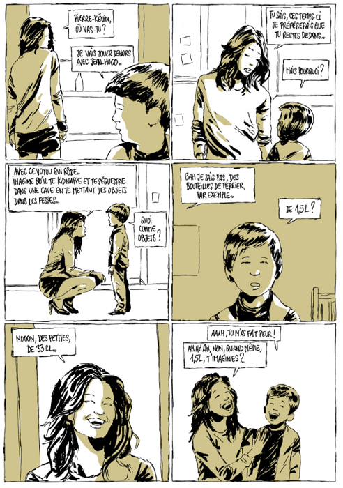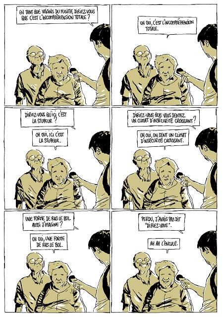 Voilà le motif de cette cavale. Fabrice parcourt la province française pour échapper aux autorités et fait des rencontres plus délirantes les unes que les autres. Le rythme est soutenu, l’humour est dans chaque strip avec une bonne dose de critique de la société de consommation et des médias (particulièrement hilarants : les débats télévisés et interviews vides de contenu des chaines d’information qui commentent la cavale de ce client dangereux mais dont on ne sait rien). Famille, école, racisme ordinaire ne manquent pas d’être épinglés au passage.